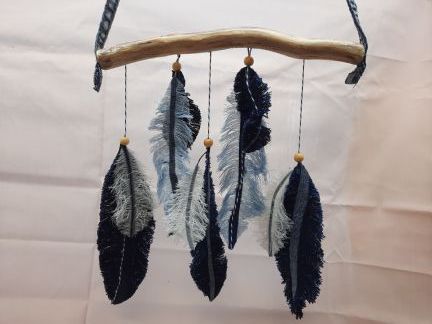 Thank you Jean, I’m glad they brightened your day. I found the idea on Pinterest and have wanted to try it for some time. Through trial and error I finally got enough to make the hanging. I probably made a total of twenty, and yes Dianna, once you get the hang of it they are so much fun to make, and addictive! I love how you get the different colors depending on how you pull the threads with the grain or across the grain. Your picture is good Jean but I will add mine also since it’s a little closer and you can see more detail. I used bakers twine for the centers and the seam from the leg for the hanger. Oh and the stick is from a cedar tree in my backyard.