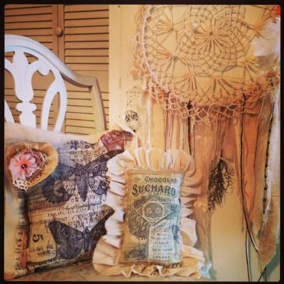 Hi y'all, this is Sherry's daughter, Markie. I came to Mom's house this morning to finally have a much needed craft day! Mom always tells me about all the fun things y'all post on here so I wanted to share what we accomplished today... She made two fancy schmancy pillows and I spent the morning working on a dream catcher made from an antique doilie. We are so excited how it all turned out and now we get to take them down to our craft booth at Vintage Soul. .jpg) |