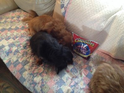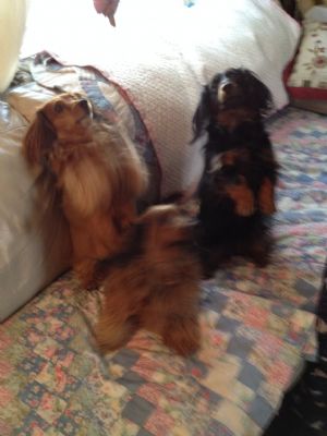 Just thought I would share a picture of my 3 Dachshunds with you, they are all excited because they got a package of Yummie Chummie Salmon Treats from Auntie Debbie in Alaska and they are so excited as they love them. The first picture is Mama Heidi standing up she is a mini long hair red, then there is Bella, she is a black and brown mini long hair, then little Holly a mini long hair red, they are looking up at the treats I am holding in my hand. The next picture is of them with their bag of yummy chummies.