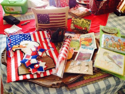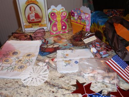 I received my package from Julie today and I just love it all, I am not sure if the flag is a table cloth or a shawl, but it is beautiful! The peach tea smells so good, and the watermelon napkins and plates look yummy enough to eat and I just love the birds that weigh down the tablecloth, so cheery, everything is just so much fun! Thank you Julie! The straws are so patriotic, I have never seen some like those before, So many wonderful things
