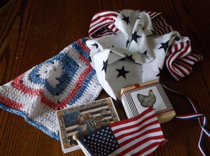 I was the lucky recipient of Debbie's 4th of July-Birthday giveaway. What a beautiful prize package she sent me! A beautiful infinity scarf, a red, white and blue dishcloth, some wonderful tea all tied together with the perfect ribbon and flag! Thank You Tom for pulling my name out of Mama hens hat and Thank You Debbis for the wonderful package!