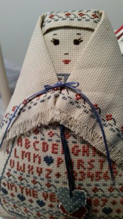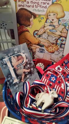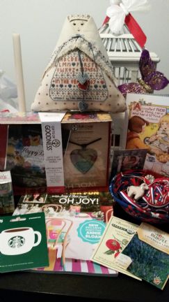 1. Cute/R-W-B Basket with Bling on it. Love It! 2. A Little Lamb ornament...which knowing me I will clip the thread and just use it a a miniature lamb in my decorating. It is so sweet. 3. Seeds...and who can't use more seeds. I love that MJF Farm girls love to exchange seeds and teas. Can never have enough of those two items. 4. A $15.00 Starbucks Card...Now she is really speaking my language. LOL 5. A small Angel Card with my Initial on It. 6. Dish Soap Bottle Apron. And I have never had one of those before. Adorable! 7. Colorado Tea. Nice! It is Blueberry a favorite tea of mine. 8. Indian Woman Doll with Sampler stitched on to her. For some reason she reminds me of A Jewish Doll. So, I am calling her my little Jewess. 9. "Fresh Style" Magazine which I have never seen before...that will be fun to peruse. 10. The Card Debbie sent was a darling Mary E. Card about Friendship. That is a keeper! 11. A Gifts of Goodness Box with a Chocolate Bar and a Heart Necklace....from Full Circle Exchange...which is one of those gifts that keeps on giving so to speak because it supports women from Foreign Countries who are doing Start-Up Businesses to make a Living for themselves and their families. I LOVE THOSE KIND OF GIFTS AND SUPPORT SEVERAL OF THOSE SORT OF ORGANIZATIONS. One of My Personal Favorites is the Proverbs 31 Ministries that helps rescue and employ...Sex Trafficked girls and young women.
