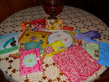 Look at all the cute things from Ruth! Wonderful trade. Everything was wrapped just perfect, so pretty. She made the Pretty red Locke and hooked mat. I love reading, so now I have new book to read and a magazine. The pretty tin hanging welcome sign. I never heard of a skog cloth, I will have to try that. A little journal with an N on. soap and cupcake papers. Plus so many other little gifts as you can see. Thank you sooo much Ruth. |
