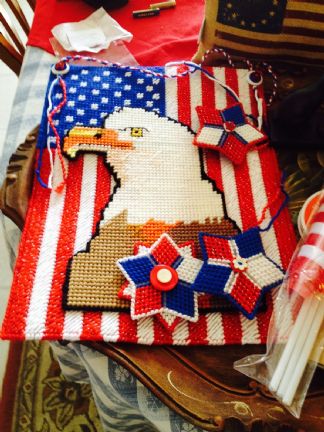 Seems my July Summer Swap Partner Ms Peggy was on the ball to make sure my package arrived in time for the 4th of July. Peggy made me this lovely Patriotic Wall Hanging with our Eagles, Stars and lots of R/W/B, it is hanging in the LR with all my R/W/B treasures. Also R/W/B Birdhouse Notecards Flags, you know a girl can never have too many:-) Especially this girl. Seeds for the garden. Plant Stakes for my herbs. R/W/B Ribbon for my wall hanging. Burlap Vintage Flag Pillow, so sweet. Decorative Pins Brown Sugar Hen Disk to put in with my Brown Sugar so it does not get hard. Boy I sure have been needing one of them. Thank you so much Peggy for all my goodies which I will treasure and helping me decorate for 4th of July. Thank you also for being a great swap partner. Happy 4th of July. Love and Hugs, Debbie