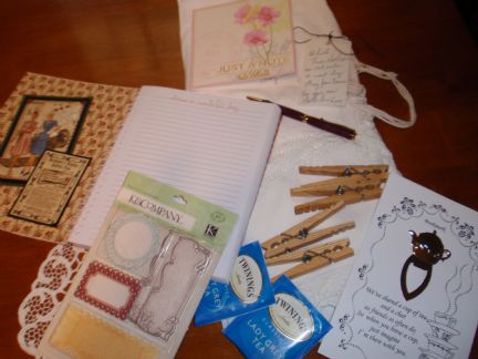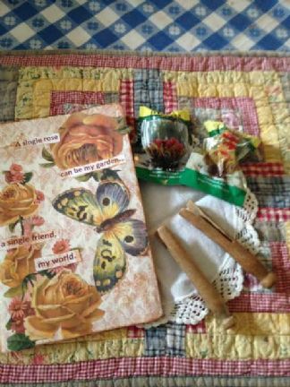 .jpg) Here is my sweet, sweet journal that Amber made me. I love roses so she used rose paper, there are butterflies and a sentiment that reads "A single rose can be my garden...a single friend, my world." So nice, she also sent a doily, two old clothes pins, I collect both and Primula tea which I have never had. I will have a cup later today when I write in my journal. Again, thank you so much and I have enjoyed having you as my swap partner for the past few swaps, it has been fun. Have a beautiful week. Hugs, Debbie |