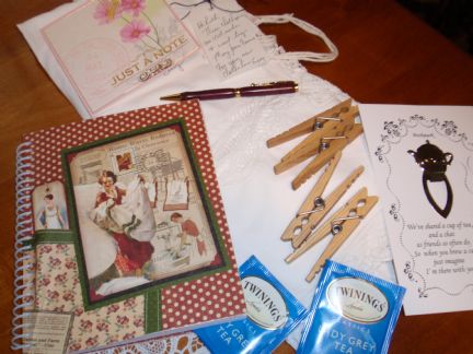 Sherry, Your beautiful package arrived today. Oh my goodness...I love, love the journal! I need lessons on how to make these! The pen is gorgeous - hubby was looking over at it, wishing it was for him! I'll have it tucked away safe and sound. He (hubby) is so funny about pens, he has his favorites, and I best not mess with them, even if they do come from WalMart! So now he is jealous :)! The clothes pins are the best ever!!! I compared them to the ones I have, well, there is no comparison at all! These are how I remember clothes pins. Will take a photo, next time I hang out clothes for you to see - that was so special for you to remember my new clothesline! Love the White Battenberg Apron, I actually didn't have one anything like this, so pretty! Thanks for all the other "tucks" tea, bookmark and journal "stuff"! The card is so pretty too! Thanks so much for being an awesome swap partner! Hugs, Ruth