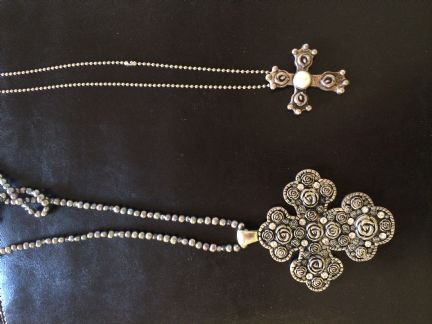 Debbie, these are the two crosses I have. I don't know if they are anything like what you have in mind. The one on the left I can't part with...it is vintage sterling from Peru my mama gave me :) The one on the right I could, but it is only about 2-1/2" long. The one on the left is 3-1/2" long and it is REALLY big when I wear it, so I can't imagine wearing one 4-5 inches! Anyway, if nothing else maybe the pics will show what you may or may not be looking for in a cross. Ackkkk sorry the photo is sideways....grrrrr.