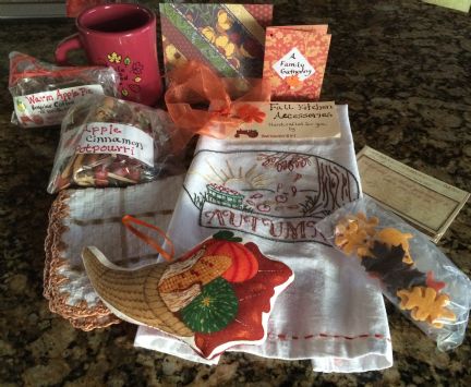 I received such a wonderful harvest package from Winnie! I just love it all. Oh my goodness, Winnie is so talented! She made me the most beautiful embroidered dishtowel for Autumn (I have admired Winnie's embroidery for ages), a dishcloth with beautiful trim, a darling cornucopia harvest ornament, some wonderful smelling apple cinnamon potpourri, then there was a darling coffee mug for fall with some of Winnie's own homemade warm apple pie coffee (Debbie has gifted me with this before and it is wonderful). Last but not least...a totally clever idea....some idea cards to pass around at a Thanksgiving or other fall dinner for guests to write memories, etc. on. and some sweet stickers to decorate them with. What a great idea!