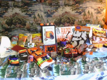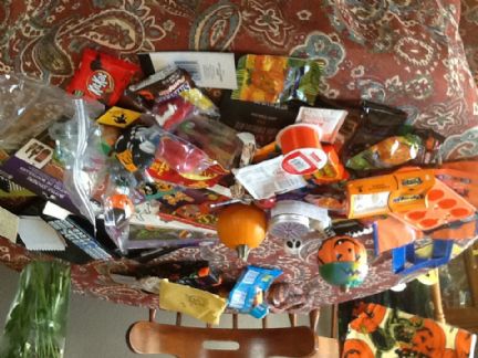 1. The Halloween Material I love it. 2. The Metal Jack-o-Lantern and candle 3. Halloween Cookies- gone so no one else could eat them! AHAHHAHAHAHAH 3. Bag of candy- Hidden in my stash! 4. A Colorado Magnet Thank you , Thank you, Thank you Marilyn so much for making a fun Boo Box for me. I just loved it. Happy Halloween!!!!!!!!!!!!!!!!!!!!!