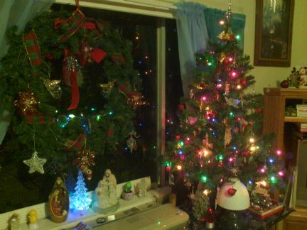 They are having a craft show at our school and one lady was setting up and she had a whole table and hanger rack full of fleece jackets she had sewn and I got to adorable pink fleece jackets for my grand babies, they have pretty kitty on them. I can't wait until they wear them. I am going to go back tomorrow to see what else they have. it will be fun. I decorated my little tree today and put some ornaments on a wreath on the window and some lights in the window. I think it looks great.
