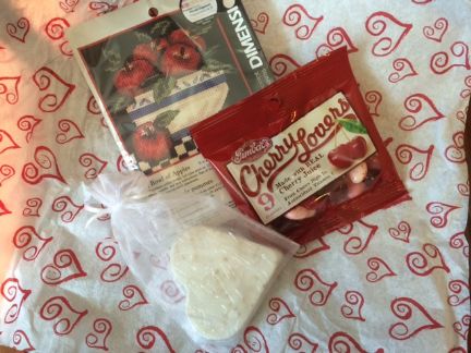 Look what the Mailman had placed in my mailbox last evening!! Whoop!! The sweetest Valentine's day greeting from Sherry! Thank-you so much for such a fun surprise. I cannot wait to try out the candy and soap and I love the apple cross stitch project!