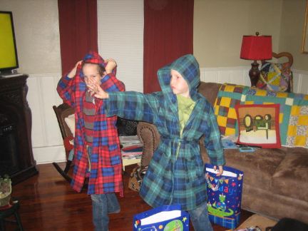 Here's a picture of my grandsons in their bathrobes I made them this month. Note the Ninja pose. LOL!