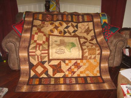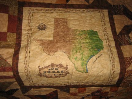 | He loves the quilt! I knew he would. Thanks for all your nice comments. And the design my longarm quilter used for it is the outline of the state of Texas with a star in the center connected to a star and then repeating. A great design for this quilt! |