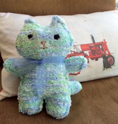 Meet Purr!! My friend is awaiting the birth of her grandson any day and I found this easy stuffed baby animal made with super soft acrylic washable yarn. It was pretty easy to make and he turned out kinda cute. I am going to go to JoAnnes for some baby flannel that matches these colors and then do a blanket stitch around the edge with the same yarn. When I purchased this yarn , I got some in browns that I am going to make up and have on hand for some future baby gift need.