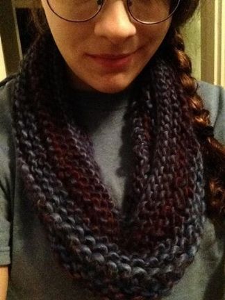 Shannon, a scarf! You can use thick wool and it is absolutely gorgeous. You can knit a straight one or a circular one. Let me get back to you. I have access to a free pattern that you might like. It was Pumpkin's first knitted item (I thought her). (Had to look back in the badge awardee from MJF for a picture)