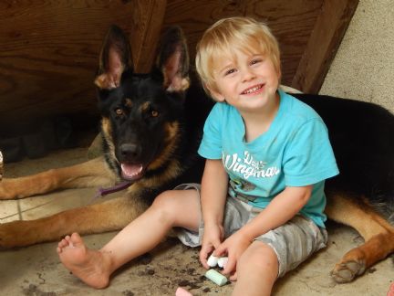 | We have a shepherd mix named Zoey. She is from a German shepherd rescue... Momma was a registered pure bred that was found on the side of the road extremely pregnant, but severely malnourished. She had nine puppies. They have no clue what daddy was, but are guessing momma belonged to a breeding circle that got rid of her when she got impregnated by a non shepherd :( Anyways, Zoey is about two and a half, about fifty pounds, and is a great protector. Since getting pregnant, she will not let me out of her sight, lol. |