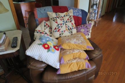| Today I sewed seven, yes, seven pillows from treasures purchased from a friend who passed away. The family had a crafter's estate sale at Betty's home and all the rooms were full of different things. I purchased lots of quilting fabric, plus some cutter quilts, and chenelle cutter spreads, some unfinished projects and also old quilt blocks. Today I simply sewed quilt blocks together for front/back of pillows and one is a piece of embossed flowers chenelle from a spread. They were fun. I purchased one body pillow at Bed Bath and Beyond for $9.99 instead of bags of filler at a craft store for $15.00 for two pillows. Anyway, seven pillows (2 for my glamping) and rest on the couch, for very little cost. They look so pretty and country. |