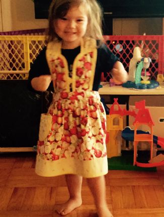 Here is my little Lily wearing her first apron, which has apples on it!  |