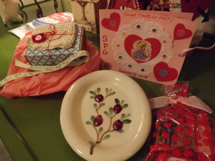 Winnie, I receive your package yesterday and Oh,It smelled so good. I could smell it from the box! I had Lily June until late last night so I wanted to wait and open it today! My day off! Oh, besides your card being so beautiful, Your note was sooooooooo a woman after my own Heart! Hot baths are my treat! After pulling and tugging and carrying 23 pound Lily June all day, my ole body hurts! My heart never gets tired!! but my arms and legs do! Granny Bear is no Spring Chicken! LOL! I love the soap, It smells so heavenly! and I love Pottery made in the USA too, I have only a few pieces and this soap dish is such a special gift! I hate to unwrap it, such a sweet washcloth also!! I will enjoy my Tea and Chocolate treats this cold night. Only high of 36 here today! We had ice on the trees this morning! We may get snow Friday morning! Your box is on the way ! Should be there Saturday! Happy Valentines!!