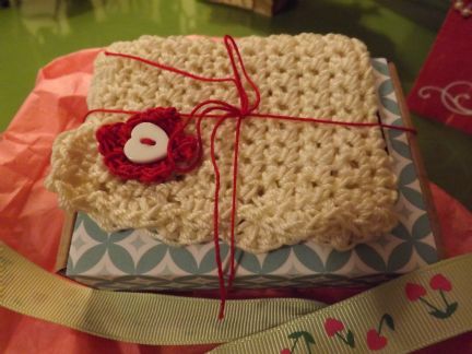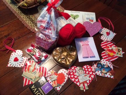 Oh my Goodness, a wonderful box of Valentines arrived from Connie today!! She made me the cutest ever vintage Valentine bunting, greeting card, and then included giant Hershey kisses, a dark chocolate bar, embroidery thread, delicious warm red yarn, a set of cards to use and decorate, and the cutest little Valentine towel. Check out these fantastic goodies!!