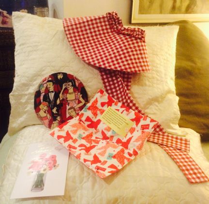 There is the cleverest device for removing hot bowls from the microwave, made from lovely bird print fabric. It will finally solve the problem of me worrying about mom burning herself when she uses the microwave. There's a hot pad/mit made from a snazzy 20's stylized print that will really jazz up my kitchen. And a gingham sun bonnet! Oh my, I love love love hats and it is so pretty! I will be wearing it all the time! Linda, your sewing is amazing, and I'm so proud that you shared your talent with me. Thank you so very much! With any luck, your package will go out today. Big, big hugs! |