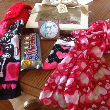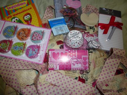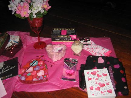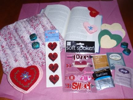 WOW! That's all I can say! Amy - what a super duper Valentines box. Amy - you are a super swapper! Amy made me a dishtowel angel with a heart-shaped thread cutter hanging from her neck, with potholder wings and crocheted arms that she made. Her 93 YO Mom put the flowers together for the wine glass bouquet - thank you, Mom of Amy! Then there is a heart-shaped box with a wonderful bar of soap, a heart-shaped box of candy (YUM YUM!), a heart-shaped box of rose-blossom-shaped shaved soaps, a heart-shaped bottle of bath salts, socks (I love socks!), a box of Bigelow Raspberry Royale tea, a beautiful black scarf with hearts on it and a note pad and pen, and , in Amy's own words, a CD of "lovey-dovey stories" about her brother and his wife, and other relatives. I can't wait to see what juicy tidbits awaits me when I listen to it. Thanks so much, Amy. It took 2 pictures to get everything in!
