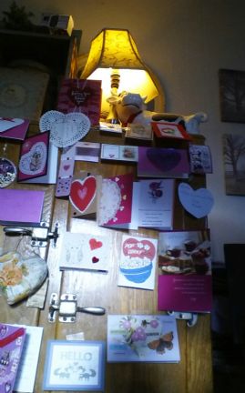| Love your decoration of cards Marilyn! I have mine all along shelves in my dining room. Getting ready to put them in a scrapbook. JT and I went to a little Italian restaurant in town for some Spaghetti Carbonara. Was really sweet how they had everything set up for Valentines. Then we went to see Star Wars The Force Awakens. Was a great evening! |