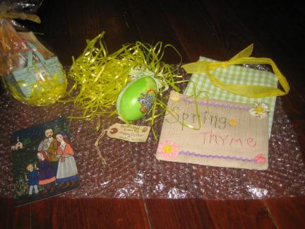 WOW! Received my March package from Winnie today. I'm not done making hers yet. Here is a picture of the beautiful handcrafted goose egg she made me, a cute handmade paper Easter basket with chocolates and tea goodies, an "Easter Vigil" postcard, bright checked spring dishtowel, and Spring Thyme mug rug. Love it all. Thank you so much, Winnie. Yours will go out soon.
