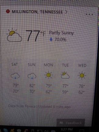 | We have had rain and storms but for the last two days it has been beautiful. 75 degrees and partly sunny with low humidity. |