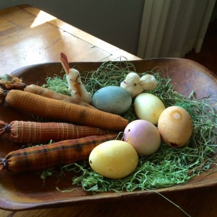 I wanted to share with you a project I did this week dying some blown out eggs using natural ingredients. The yellow dye was made with curry powder, the blue was made with crushed blueberries and the brown/pinkish purple were both made from fresh beets. All you do is add your natural ingredients to water, simmer for 30 minutes to concentrate the colors, cool enough to handle and add 2 teaspoons apple cider vinegar to each cup of fluid. Place eggs in dye bath and allow to set for 30 minutes or more. Although they are not as bright in color as food coloring, I love that they are all natural. The muted colors are pretty to me too. The handmade carrots came from Ebay and the little chicken and cotton batting rabbit were from my Easter basket as a child.