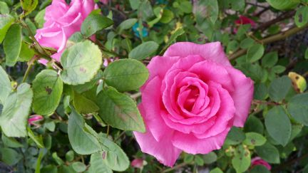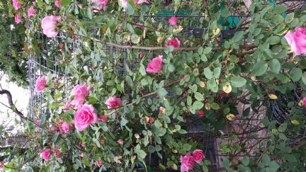 One lonely red beauty, and my climbing thornless rose...Zephirine Drouhin. I love this thing. The best one is about 10 feet long now. Two are rather shady, but doing well. They are easy to root. |