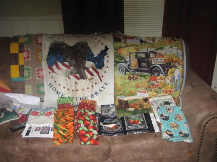 On my trip I did manage to go to one antique shop and the Fabric Depot. My package from Fabric Depot (I had them mail it) arrived today and I love my fabrics! Here's a picture! I wish you could blow it up to see up close all the fabrics. I got 4 panels, 2 retro fabrics, 3 fruits and 3 veggies, and enough already-side-hemmed-retro/vintage-looking dish towel fabrics. Everything was at least 30% off, so I couldn't pass it up. LOL! I think I am going to make the farm-truck panel into a window scene by cutting it up and putting in window sashing. I love the old truck - I've been looking for one to go with my old house. LOL!