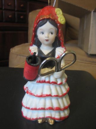 At the antique shop I found what I think is a very unique pin cushion - it is a porcelain Spanish-looking lady with a small pair of scissors and a small spool of thread. The only pincushion is a half-ball at the top/back of her head. There are no markings on the bottom, but I am assuming it is from China - maybe not. I love pincushions, so was happy to find this.