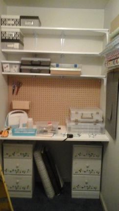 Oh my what a topic. I have been thinking of these very things. I have so many things and having going through so much of it lately. Since my bil is still occupying my sewing room, my sweetheart of a husband reconfigured my sewing "closet". I don't do any sewing in there but with help of pinterest we were able to take a space that just kept getting fuller for storage instead of craft storage and change it into usable space. I will use the work table for papercrafting and such. But everything was getting put in there. It was driving me crazy. So we took everything out. My bedroom was a mess for a few days. I sorted through almost everything. Still have a few things to empty and sort, but here is a picture of what we did on the end.