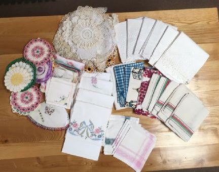 Speaking of cleaning things out, I had a customer bring me a bag full of trivets, hand made pillow cases, doilies (that's a pile in the picture) and some hankies that were done by her aunt during the depression (a couple during the 60's - not pictured). I love WW2 history and how women beautified their homes with items they created during a time of scarcity. Here is a picture of the loot