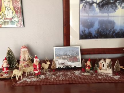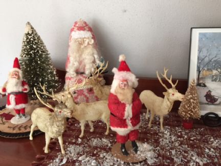 I brought out my Mom's old cotton batting Santas and my Grandmother's celluloid reindeer and created a village. I also have some of those old bottle christmas trees in green, red and white with snow on them. At the right of the scene is an old little church that was part of the family decorations from before I came along. Once it had little paper stain glass windows and there is a place in the back that a small light could be put in to make the church light up. I think these old houses were widely available at Woolworths and were not expensive. The Santas were pretty old and mom repainted them and added some new cotton.