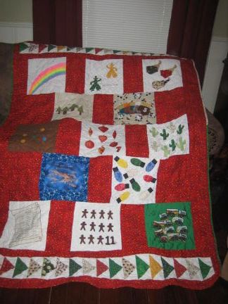 Since today is the 5th Day of Christmas (twelvetide), here is a picture of my Twelve Days of Christmas quilt. I made this in 2006 in a swap. We were divided into groups of 3 and each person made 4 blocks for the others in the group. Mine were 2 Cowboys roping, 3 cats in bags, 8 cactus, and 10 bright bulbs.
