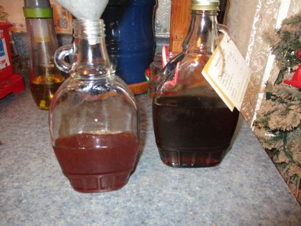 The one on the left is mine. The one on the right was purchased. It doesn't yield much (it takes 40 gallons of sap to make 1 gallon of syrup) but it sure is delicious!!! It looks like the sap should be flowing for about a week now so hopefully I can make more than we eat :) |