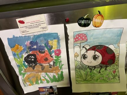 Oh my goodness look what arrived in my mailbox yesterday, new, lovely color pictures for my refrigerator. And they are lady bugs, plus a sweet little magnetic lady bug that I put at the top of the pictures. I tell you Wildflowers they bring me such joy, I was just a hooping and hollering as I showed them to my guys. Silly I know but it is the sweet things like this that touch my heart. Thank you so, so much Chris and Fallon for thinking of me, I appreciate you both so much. It has been awhile since I had pictures on my fridge. I am waiting for Wally to get a bit older to color me a few. Children sure make the World go around and bring so much joy to our lives :-)
