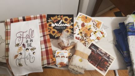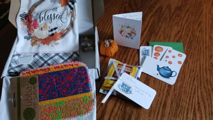Sherry, I received your pkg today. Thank you so much for everything! I love the towel and cute little pumpkin. I have just the spot for it on my little hay wagon. Also for the tea and cute tags and the scrubba and pocket angel. I love being in my kitchen and the towel will definitely pretty it up! I wish you cooler days ahead!