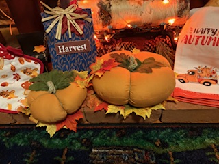 | Laurie's box arrived today and it was full of wonderful fall goodies. She made these two amazing cloth pumpkins that look like they are sitting on some fall leaves!! They are adorable. She also included a kitchen towel with a cute red truck, I love red trucks!!) and two fall themed potholders. My kitchen is set withe pumpkins!! Since I cannot post a photo from my computer, I have emailed Laurie for her email address and when I get that, she can post the photos so you all can see. Thank-you Laurie for all my fun surprises today!! Farmgirl Mail is hands down THE BEST!! |