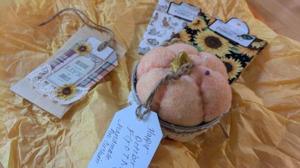 .jpg?v 58024245) Thank you so much, April! Your beautiful handmade pumpkin pincushion and fat quarters arrived-- just last week, my daughter turned 7 which was just old enough to start taking sewing classes at fashion camp. Ever since she got back from her first lesson, our sweet machine has been working overtime punching holes in tracing practice worksheets and your gifts will be put to good use!
