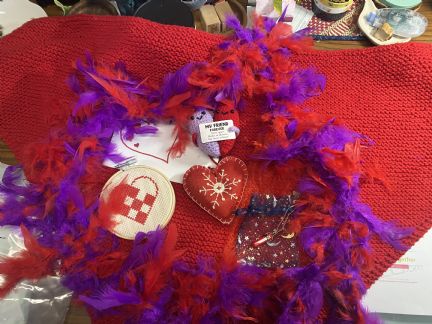 My RED goodies arrived from Debbie!! I love them so much! She made the most beautiful shawl for me! I also got a red felt heart, a white and Red Cross stitch, and the cutest pair of crocheted friends that are red and purple (which is me and Debbie) and a beautiful red crystal necklace!! Thanks Debbie for being my partner!! This was a fun swap! :)