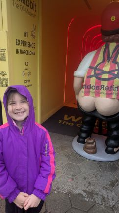Our second favorite museum was in the same block and had lots of VR and art exhibits to share about elements of Barcelona culture. We got to put on VR headsets and got a 360* view of St. Jordi slaying a dragon, its blood seeping into the ground and red roses sprouting from it, which Barcelonans exchange with each other on April 23rd. We also got a 360* of castellers building human "castles" or towers of people 8+ people stories high. We learned the city has a sense of humor and that these Caganers (poopers) are considered good luck to hide in one's Nativity creche. We also learned these capgrossos or giant paper mache heads are common in festivals and parades.
