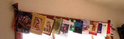 Posted - Dec 20 2013 : 11:13:26 AM Some tartan plaid wire edged ribbon, 3 cup hooks and I have a display for Christmas cards over one of my large living room windows. Hang them up with some mini clothespins and enjoy!!