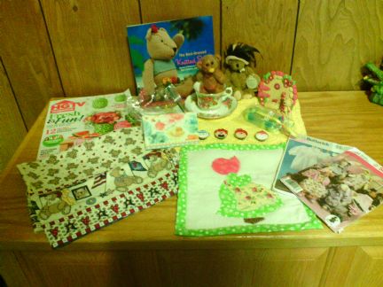 Posted - Aug 07 2014 : 11:22:59 PM I received my package from Marcy today, Everything was just wonderful and she even felted a little bear for me. It is so cute, and there is a beautiful Tea cup and saucer and everything is so nice!I love the bear material with the fat little bears on it and it is patriotic and I really love that. The Bear knitting book is wonderful and the patterns are cute. Thank you also for the popcicle soap bar and the little bottle cap raggedy Ann and Andy and snow men. and thank you so much for the Tea, yellow wash crocheted washcloth and the magazine and the Holly Hobby square, and thank you also for the other cute little bear with it's moving head and arms. I love it all. Your package went out today.