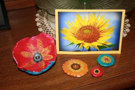 Posted - Aug 27 2014 : 07:26:27 AM Mary Jo, My package came today! The magnets are awesome and I will be using them right away. So many pictures and art from the grand kids and now I have more magnets to hang it! Don't you just love the card I got of the photo Mary Jo took of the sunflower. So bright and happy! Such a pretty little bowl. Don't know what you used to make them but I really like it all.  Thanks again for swapping Mary Jo. It was fun and thank you for thinking of it Danyel.