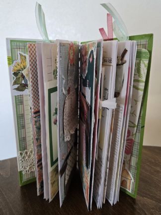 Posted - Mar 04 2026 : 1:52:54 PM I also dabble a bit in "Junk Journals". I've made some as birthday gifts for friends. This one is just 8 inches tall and 4 inches wide and it for me . . .with notes, tags, lace, pockets, bits and pieces of things from friends, including some farmgirls. It's 8 1/2 inches tall and 4 inches wide, about 24 pages or so. It's just for my own treasure.
