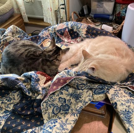 Posted - Feb 24 2026 : 11:59:18 AM My UFO of the month is to finish a queen-size quilt I started 10+ years ago. I spent the last week on the quilting. I got up bright and early to put the binding on but the cats had other ideas.