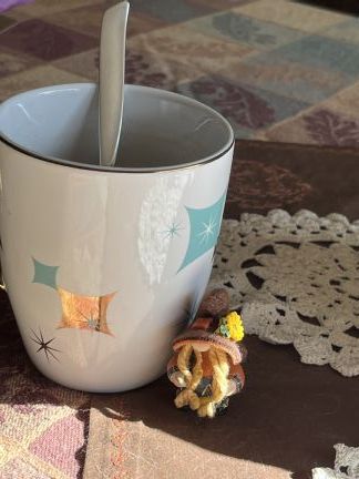 My little she-gnome is watching over me..and my cup of mushroom coffee.. Notice the fun tissue paper? :>) …